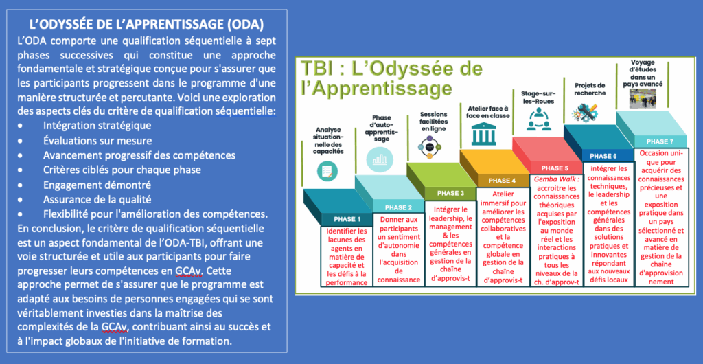 Ă€ cette fin, TBI a dĂ©veloppĂ© et proposĂ© une « OdyssĂ©e de l’Apprentissage » composĂ©e de sept Ă©tapes allant de l’analyse de la situation, de l’auto-apprentissage, des sessions en ligne, des ateliers en face Ă  face, du « Stage sur les roues », de la mise en Ĺ“uvre de projets de synthèse, d’un voyage d’Ă©tude dans un pays Ă©tranger et plus avancĂ© (voir encadrĂ© ci-dessous).
